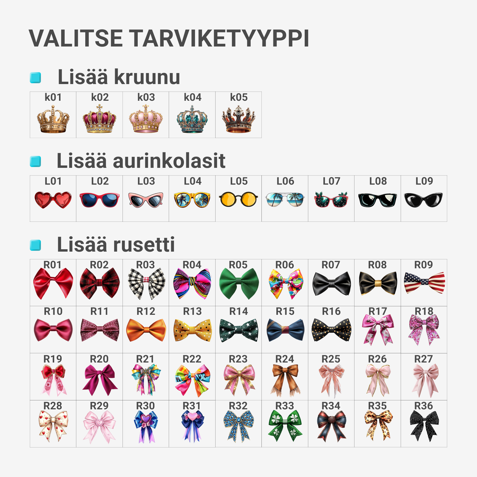Lisävarusteita valittavana – lisää kuninkaallinen kruunu, lumoavat silmälasit tai tyylikäs rusetti 36 vaihtoehdon joukosta, jotta ilmeestä tulee entistäkin värikkäämpi!