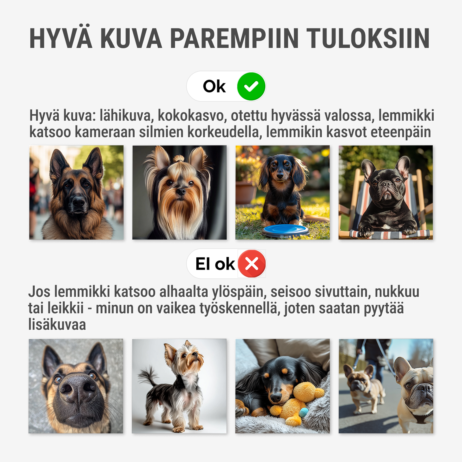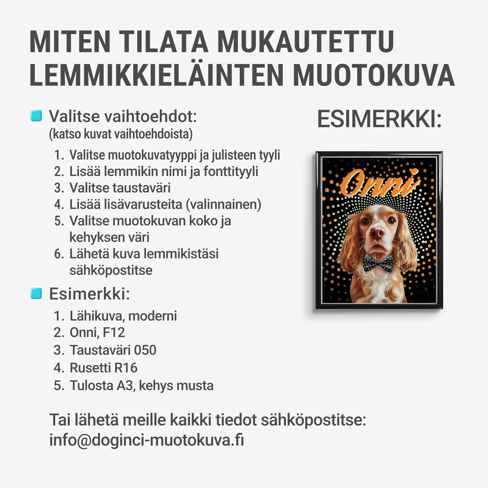 - Kun olet tehnyt tilauksen, valmistele ja lähetä lemmikkisi kuva osoitteeseen info@doginci-muotokuva.fi. Muista mainita tilausnumerosi viestin otsikkorivillä – meillä on yksityiskohtainen opas täydellisen kuvan valitsemisesta julistetta varten.