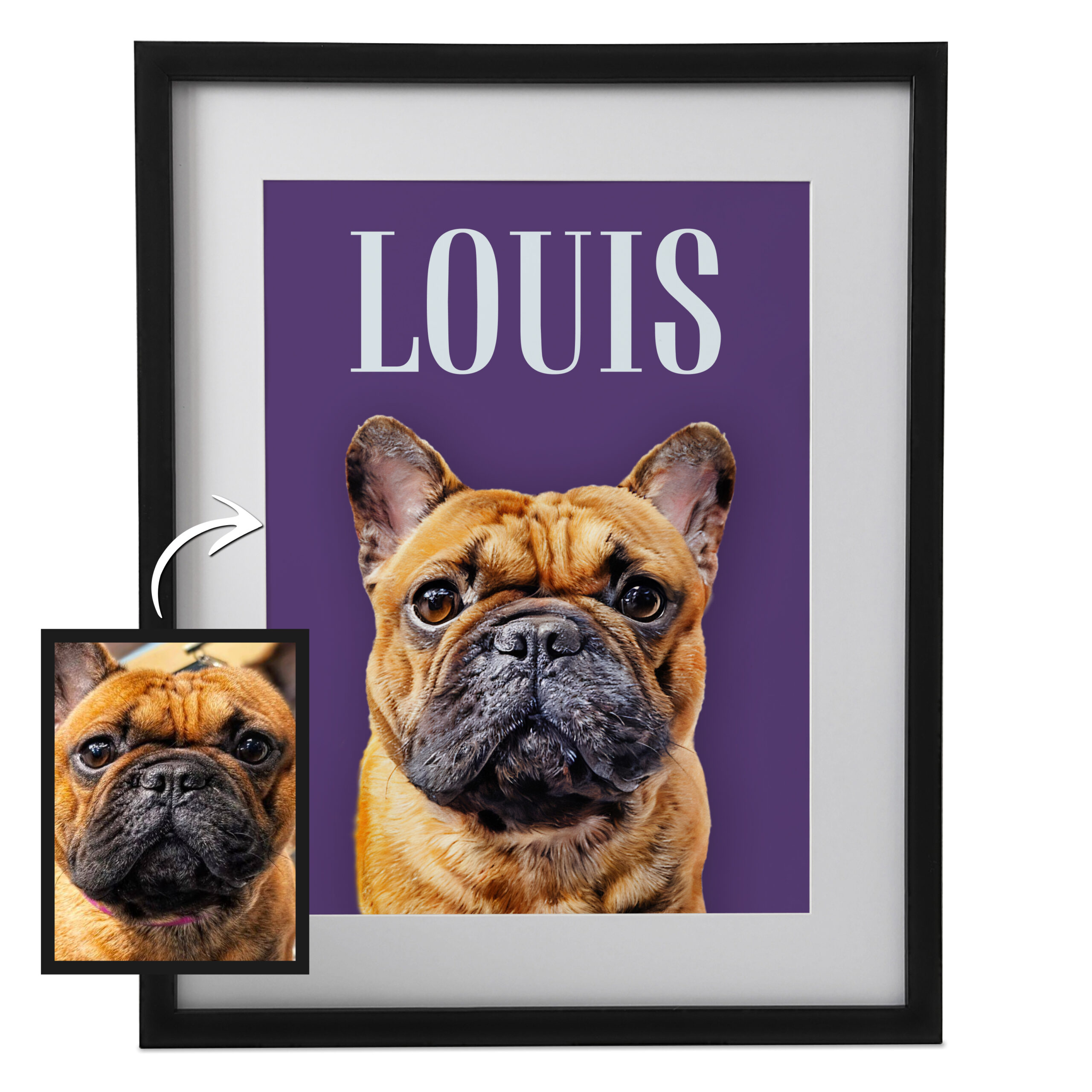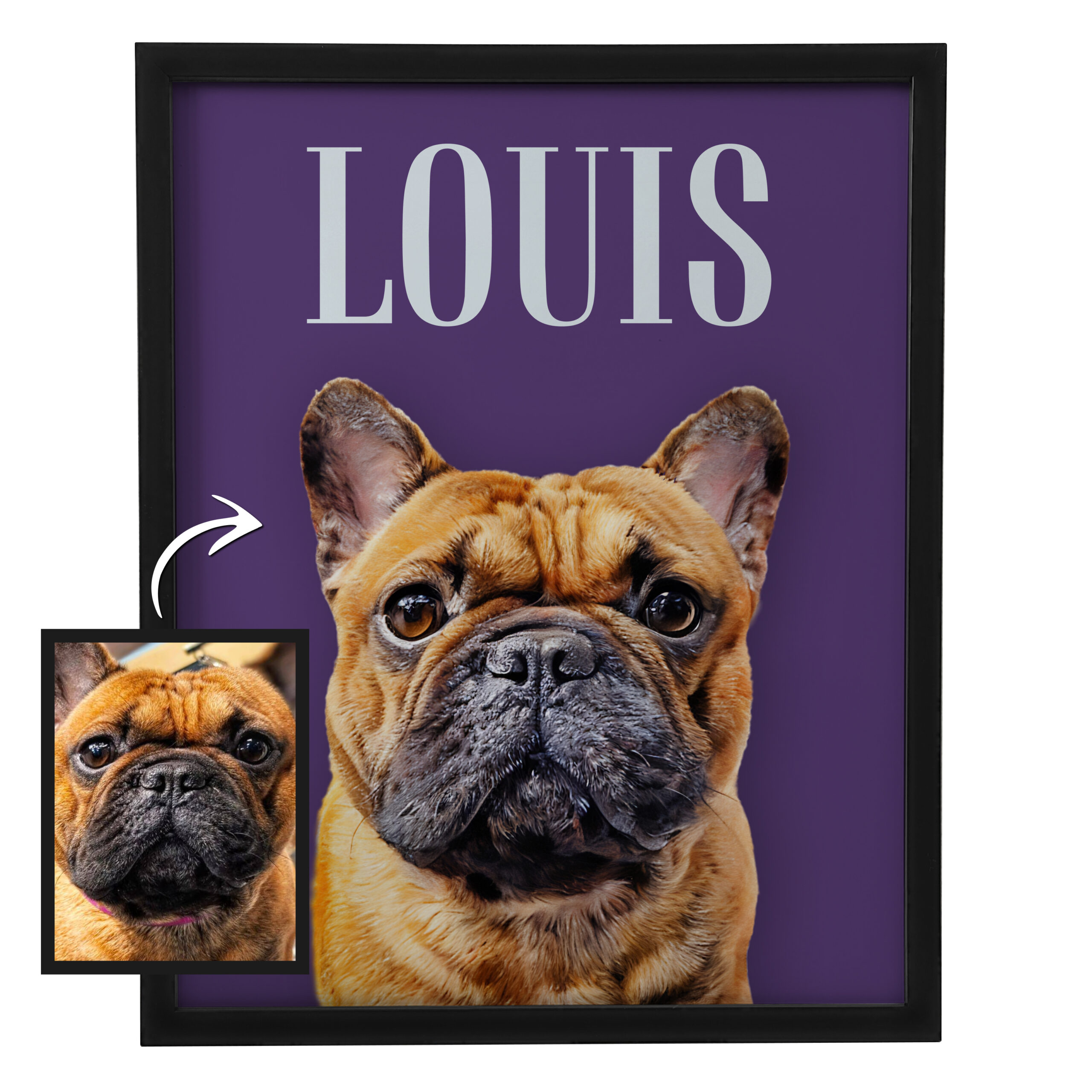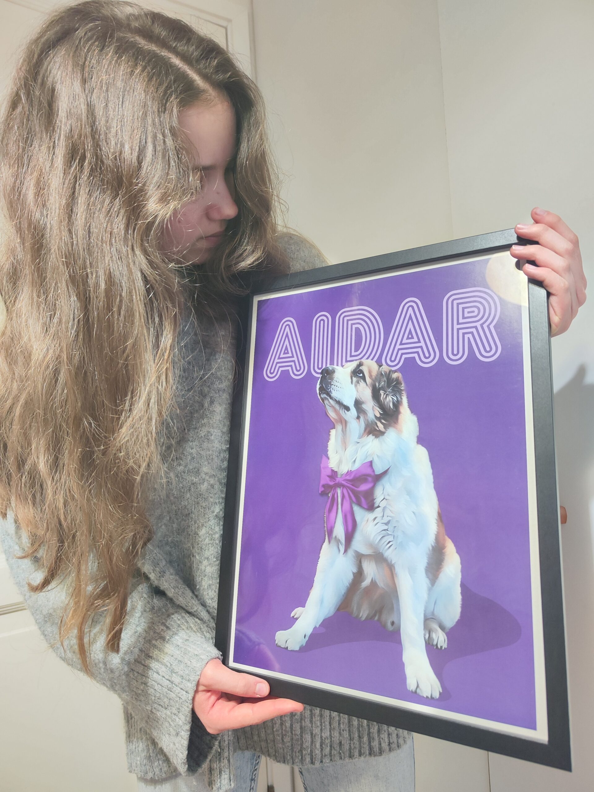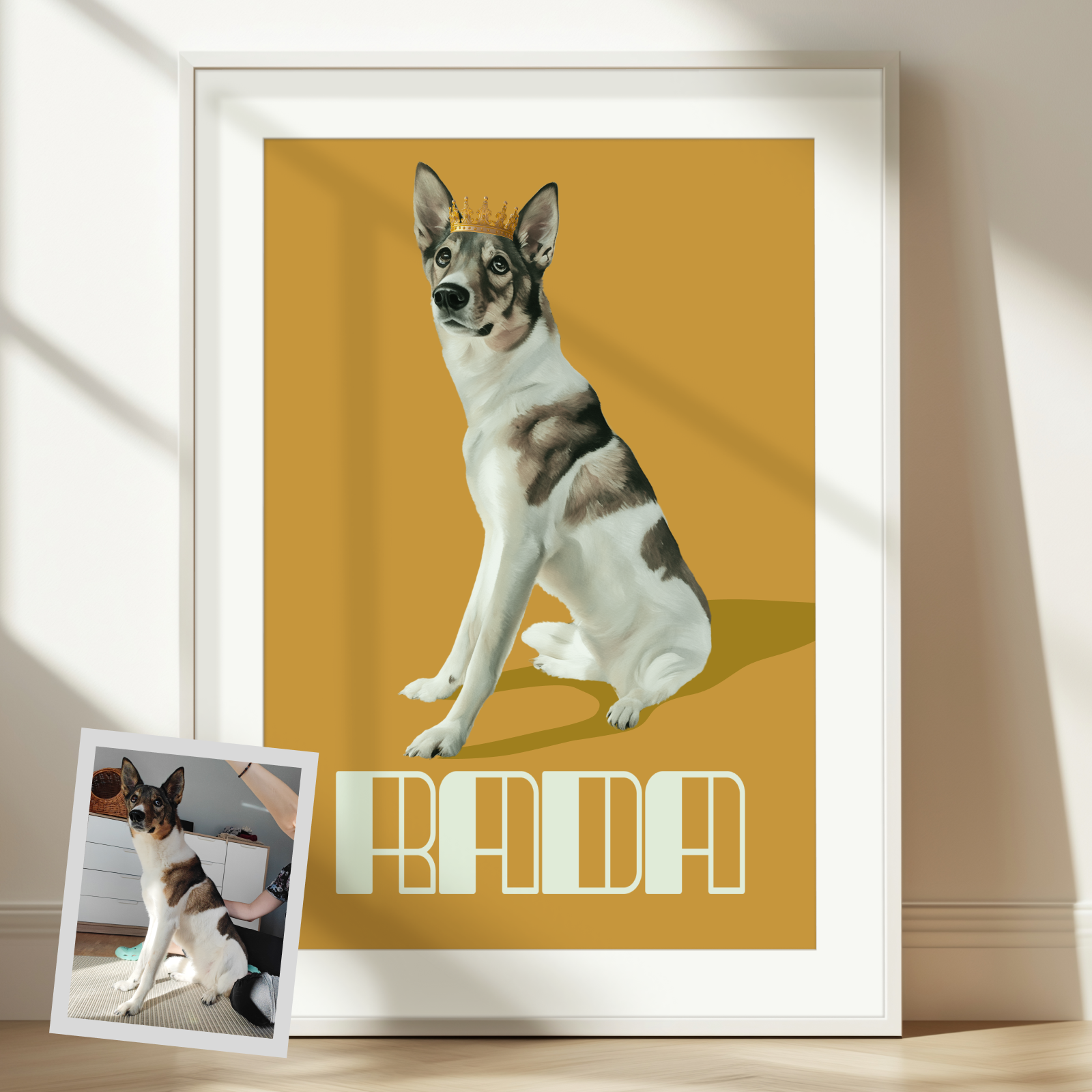 Kun tilaat, saat korkealaatuisen tiedoston (300 dpi), joka on valmis tulostettavaksi. Voit tulostaa sen kotona, käyttää paikallista painopalvelua tai tilata julisteversion verkosta. Moderni koirajuliste personoitu.