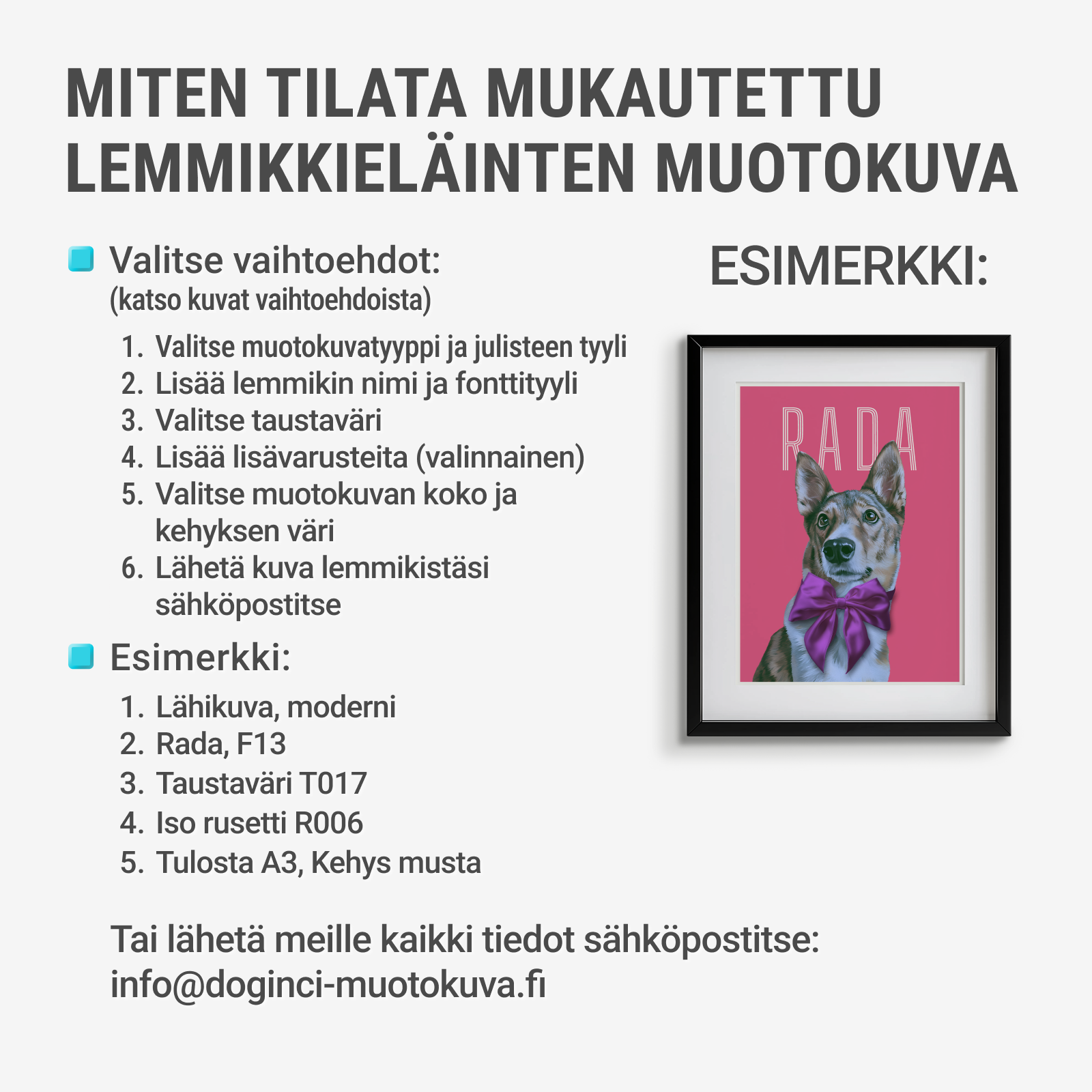 - Kun olet tehnyt tilauksen, valmistele ja lähetä lemmikkisi kuva osoitteeseen info@doginci-muotokuva.fi. Muista mainita tilausnumerosi viestin otsikkorivillä – meillä on yksityiskohtainen opas täydellisen kuvan valitsemisesta julistetta varten.