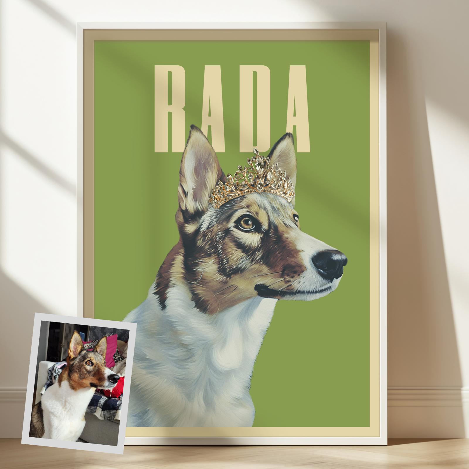 Lemmikkisi ansaitsee kuninkaallisen kohtelun. Minimalistinen vintage-muotokuva, pehmeät pastellit ja kruunu valinnaisena. Tilaa nyt ja anna lemmikkisi loistaa taideteoksessa, joka koskettaa sydäntä.
