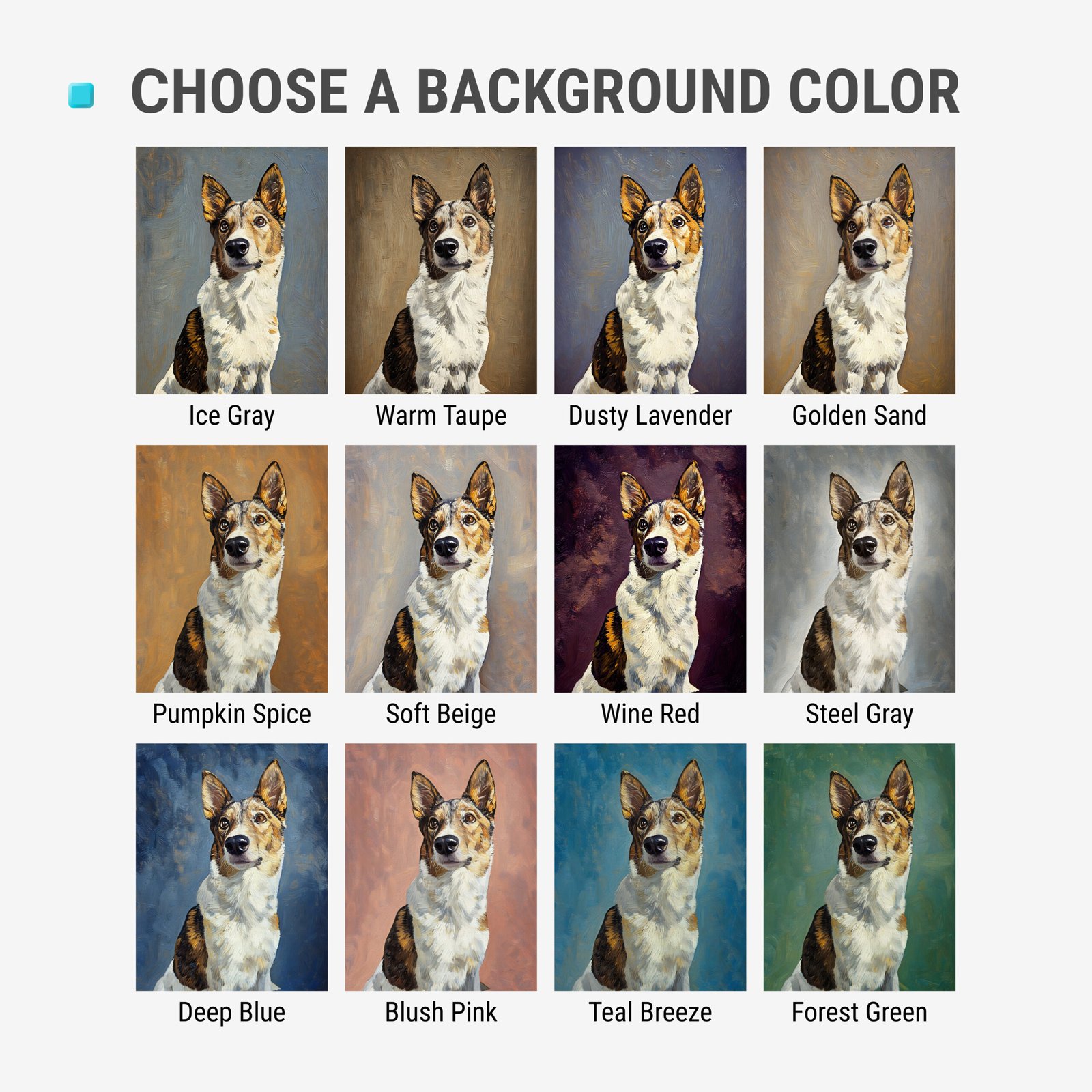 Ilmoita lemmikkisi ainutlaatuinen persoonallisuus henkilökohtaisilla digitaalisilla lemmikkimuotokuvillamme. Jokainen muotokuva on luotu ammattimaisilla digitaalisilla maalaustekniikoilla ja graafisen suunnittelun työkaluilla, ja se on kirkas ja sopii erinomaisesti sisustukseen tai lahjaksi. Valitse monista maalaustyylisistä taustoista.